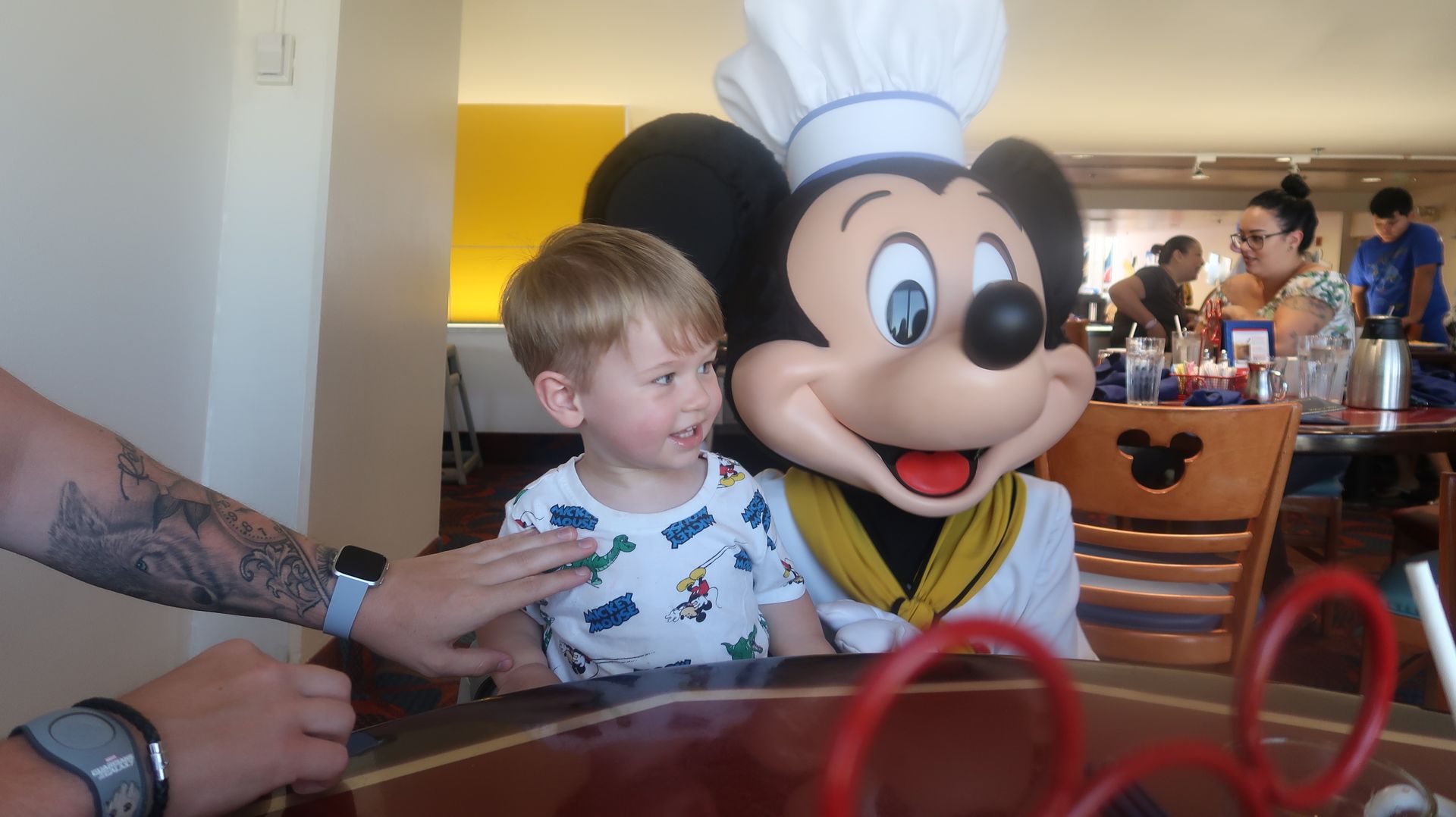 We did have stuff planned though, starting with a character breakfast at Chef Mickey’s and ending with MNSHHP. Last night I had told/pleaded with Louise that we needed to leave the villa by 9.40. That of course meant that I was pacing the lounge like some caged tiger listening to the never-ending sound of the hairdryer coming from upstairs at 9.55. Admittedly, it’s been some time since I used such a device, but it did seem more time than was necessary for Louise’s amount of hair.