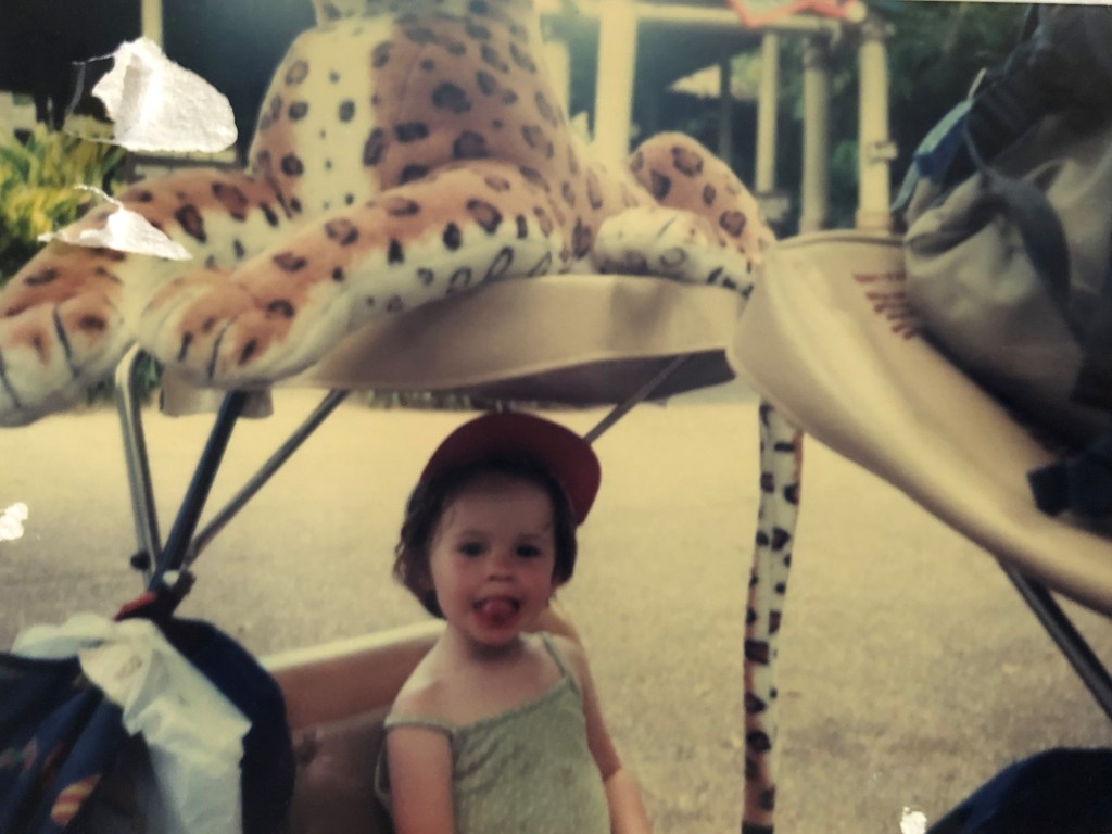 This was definitely 1999. Rebecca is two here and looking very similar to a currently two-year-old Freddie. This was taken at Busch Gardens. On top of her stroller is one of two giant stuffed toys that were won that day on the boardwalk games. We somehow got them home and they still sit in my Mum and Dad’s house. When the girls were younger and slept over at Nana and Grandad’s they had to be moved out of the bedroom as they terrified them!