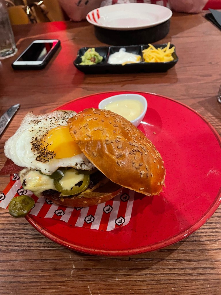 There is my burger (there are fries in a separate basket out of shot) with Louise’s tiny portions of guacamole, watered down sour cream and salsa in the background. The sizzling platter was 95% onions and 5% chicken.