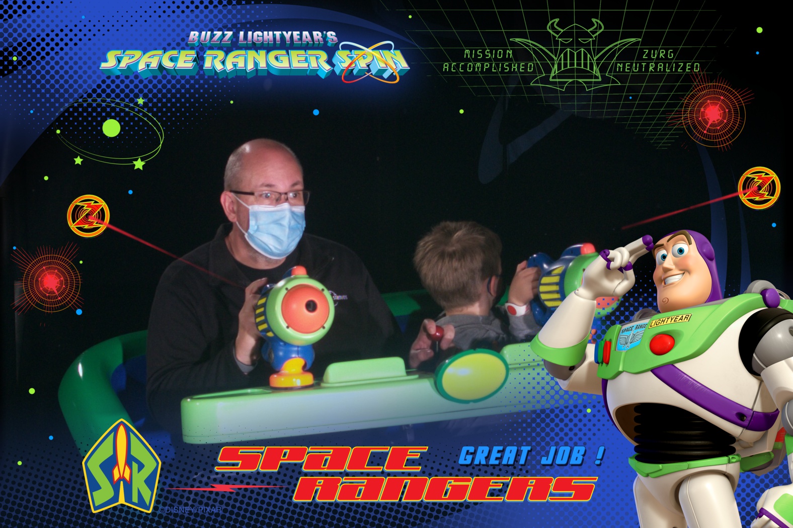 Queues were looonnnnggg everywhere. The People Mover was “only” twenty minutes so we did that. Freddie then wanted to ride Buzz so we joined a 45 minute queue which only took 25. I rode with Freddie, who employed the “no look” aiming method which led to another crushing defeat at my hands.