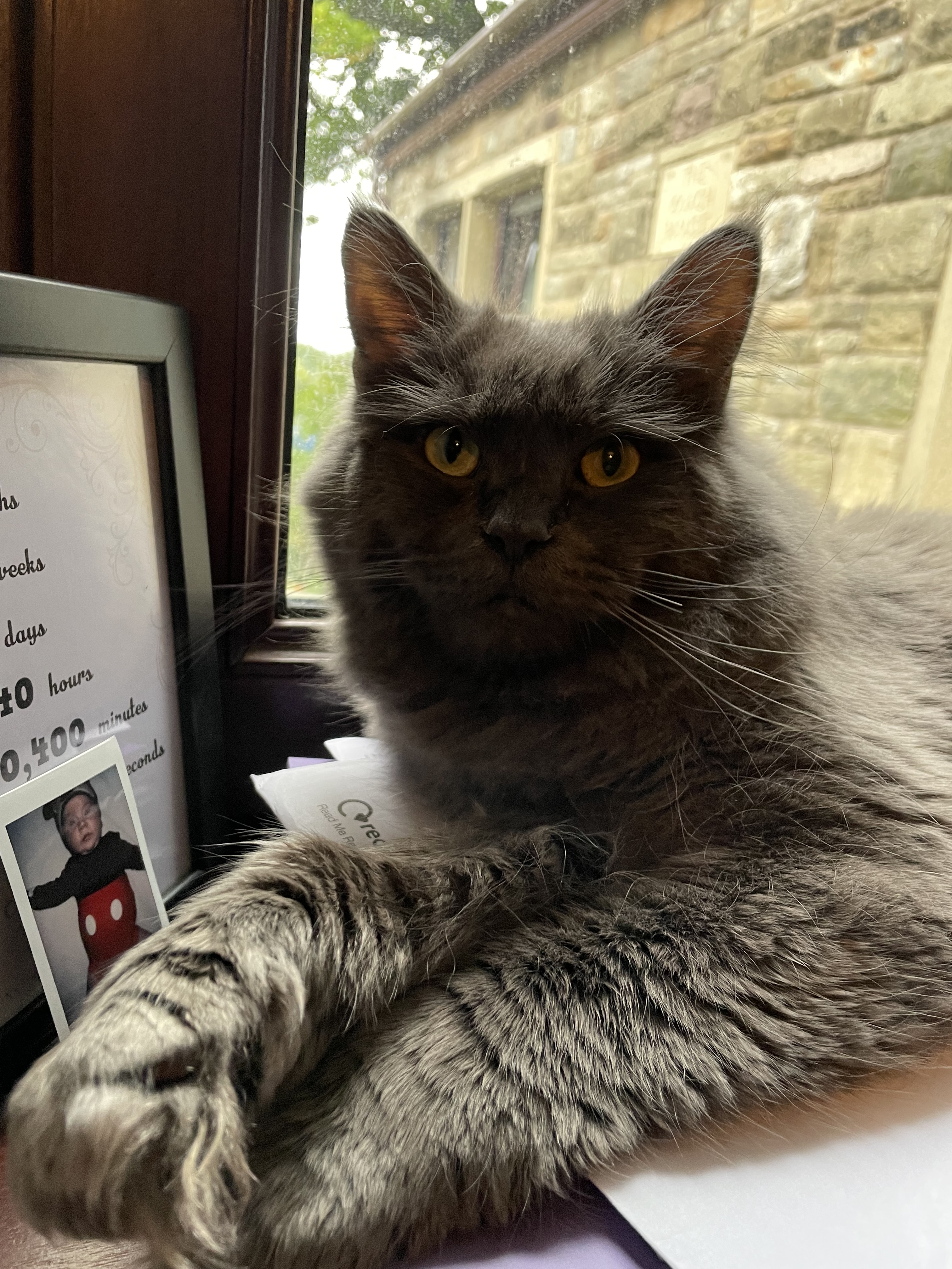 Hades, our newly inherited cat, has settled pretty well too. He’s had the occasional forlorn wailing session but we suspect it is because he still has his bits and bobs and there are two (neutered) female cats in the house. He will be “done” soon. What a welcome to the household! Here he is looking as if he knows what I just typed.