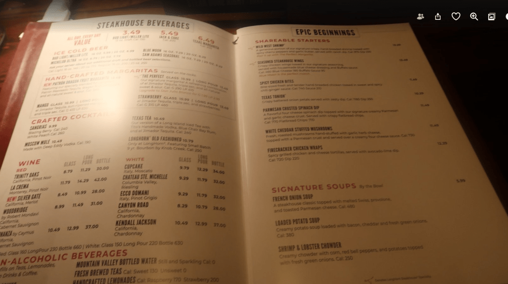 With that being clearly a non-starter we set off in search of an alternative. We thought of Bahama Breeze and headed in that direction but again the traffic to get there was queuing from the Premium Outlets right the way down to the junction where BB is, so instead we bailed at the Longhorns we were sat in traffic outside of.