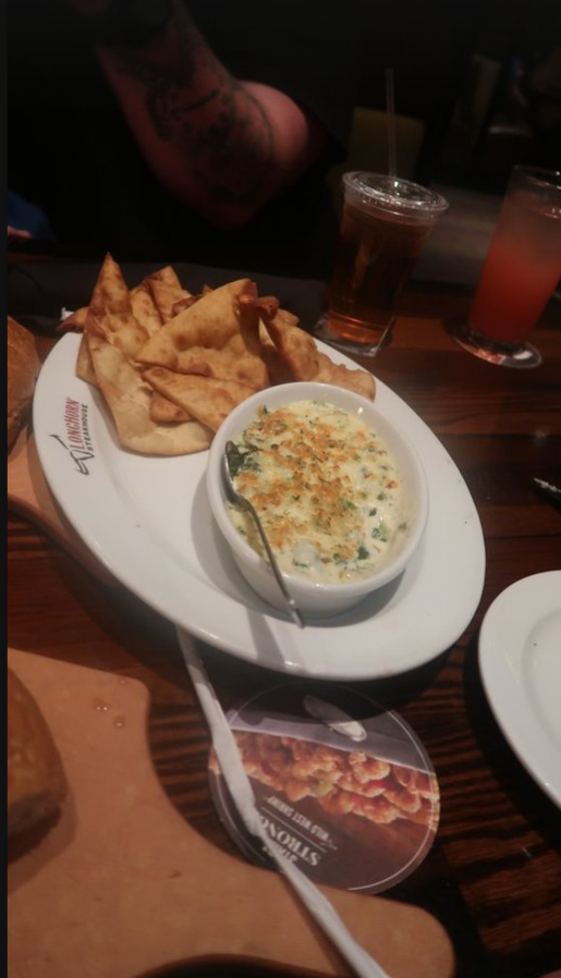 There was a bread service and we started with two appetisers to share. Spinach Artichoke Dip and a kind of Bloonim’ Onion thing.