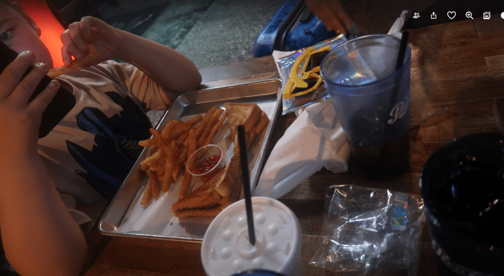 We had a look in Bake My Day (a bakery) and got Dougie some popcorn. With everyone back from riding, Louise and I took Freddie on the Mummy as Tom needed medical attention. This was not Rip Ride Rocket related. As often tends to happen with Tom’s feet on these trips he had blisters that were resembling World War 1 trench foot and he was really struggling. There were scenes when he was trying to take his socks off that I cannot describe here.