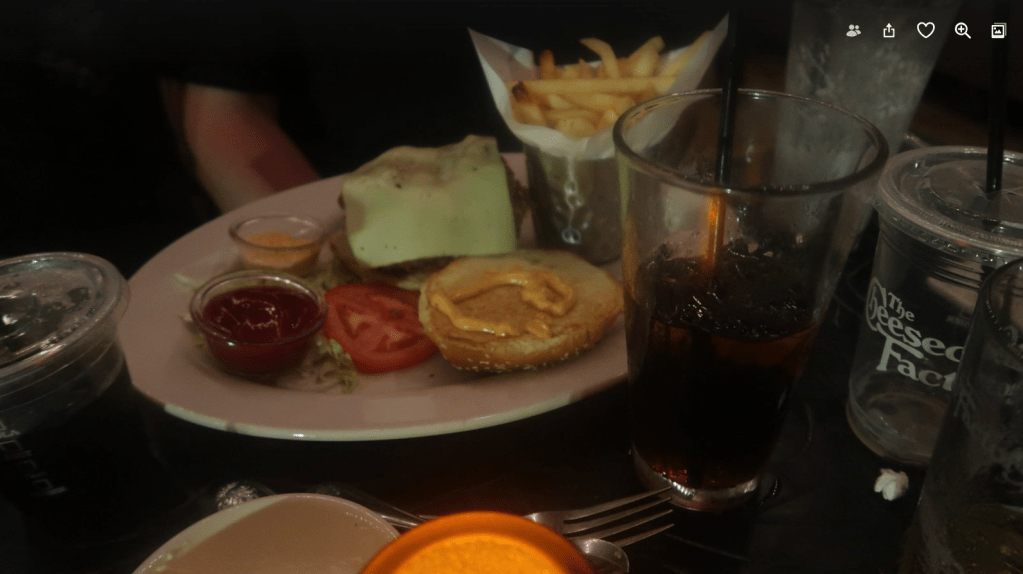 There were more showers for all and more clothes before leaving again at 7.45 for dinner at The Cheesecake Factory. As we drove along Funie Steed Road on our way to the 192 and then I4 I had to undertake an emergency stop for a rabbit that was skipping about in the middle of all the traffic. Doing that in a vehicle the size and weight of the thing we were in was no small feat and by some miracle, I managed to avoid the poor thing.