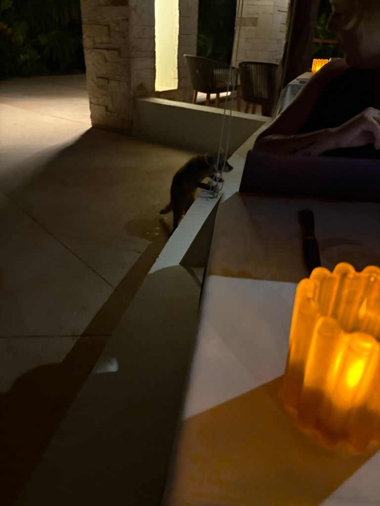 I couldn’t finish it and threw a couple of pieces to our new friend. Eventually he jumped up and the wall at the side of me and stared at me. Then, maintaining eye contact, his very human hand reached across the table and slowly dragged the steak from my plate and ran off into the bushes.