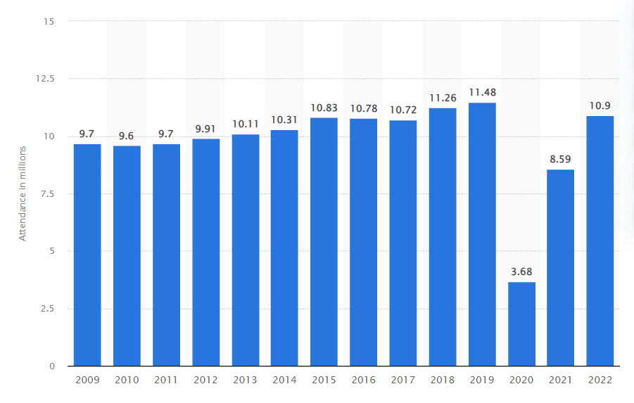 Pre-pandemic attendance at MK was higher and this is replicated at all four parks, with only DHS almost back to pre-Covid attendance. Of course, we don’t yet have 2023 or 2024 data so that may show a sudden spike?