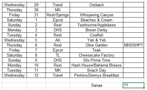 We did have stuff planned though, starting with a character breakfast at Chef Mickey’s and ending with MNSHHP. Last night I had told/pleaded with Louise that we needed to leave the villa by 9.40. That of course meant that I was pacing the lounge like some caged tiger listening to the never-ending sound of the hairdryer coming from upstairs at 9.55. Admittedly, it’s been some time since I used such a device, but it did seem more time than was necessary for Louise’s amount of hair.